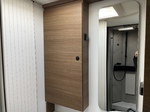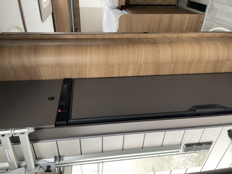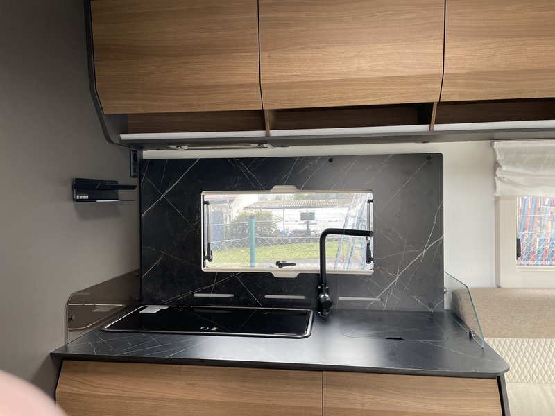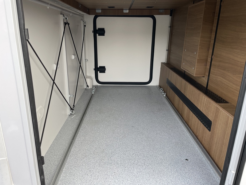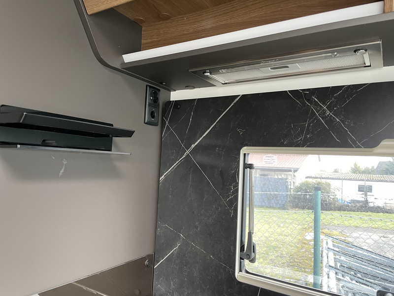Wohnraum: Karosserie und Unterboden in Polyester, Seitenwände und Dach mit holzfreiem Aufbau, Fenster mit Doppelverglasung Dometic D-LUX, Große Dachluke im Wohnbereich (70 x 50 cm), Heck mit hochwertiger Deko und Spoiler, Heckstoßstange mit LED-Leuchten, 3 zentrale Bremsleuchten Heck, Schlösser an den Außenklappen, 230 V- und 12-Steckdosen in der Garage, Fixierung Fahrradhalter