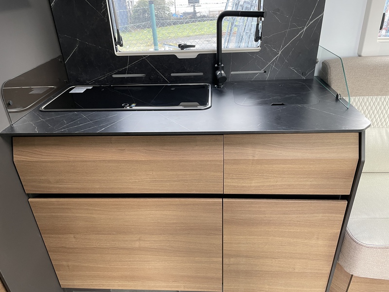 Küche: Spülbecken und 3-Flammen-Kocher mit elektrischer Zündung, großer Kompressor Kühlschrank 150 Liter mit Schublade für 9 Flaschen e touchscreen, Fensterverschönerung, ausziehbarer Wasserhahn, beleuchteter Gewürzhalter, Küchenplattenverlängerung