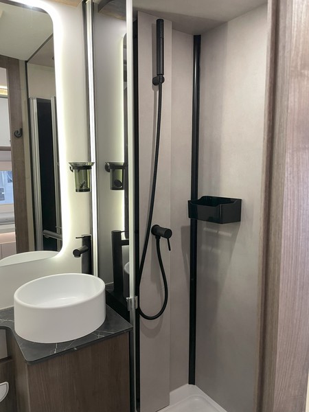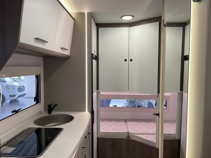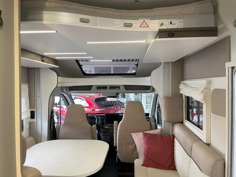 Karosserie und Unterboden in Polyster, Seitenwände und Dach mit holzfreiem Aufbau, Kopfteil oberhalb des Fahrerhaus 100% aus GFK, Fenster mit Doppelverglasung Dometic D-LUX, Heckstoßstange mit LED-Leuchten, Schlösser an den Außenklaoppen, 230 V- und 12 V-Steckdosen in der Garage, Fixierung Fahrradhalter, neues PAMPLONA + WARM GREY-Mobiliar, obere Schränke Ambiente LED-Beleuchtung, Schubladen mit Softclose, Kissen mit wechselbaren Bezügen, höhenverstellbarer elektrischer Teleskop-Esstisch, Innentür mit direktem Zutritt zur Garage, Hubbett elektrisch 2 Schlafplätze (max. 230 kg), USB-Steckdose im Schlafbereich, 4 dekorative Kissen passend zum neuen Möbeldesign, 22A Batterieladegerät mit Lithium-Option, Spülbecken und 2-Flammen-Kocher mit elektrischer Zündung, großer Kompressorkühlschrank 150 Liter mit Schublade für 9 Flaschen, beleuchteter Gewürzhalter, Küchenplattenverlängerung, separate Dusche mit Korb und Hängestange, Duschplattform, kombinerte Heizung / Gas-Warmwasserboiler Truma 4000 W